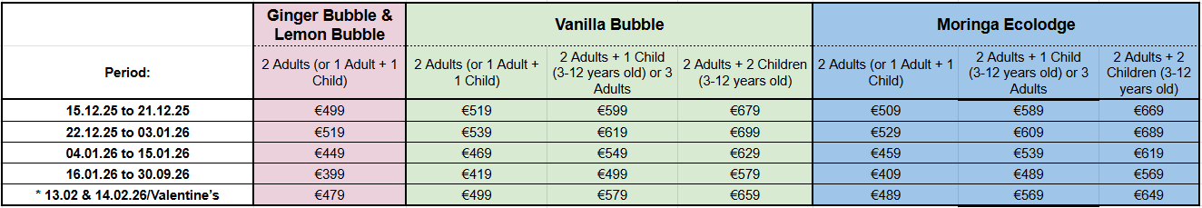 - Maximum child occupancy = 2 kids in Vanilla BUBBLE / 1 kid in Moringa ECOLODGE